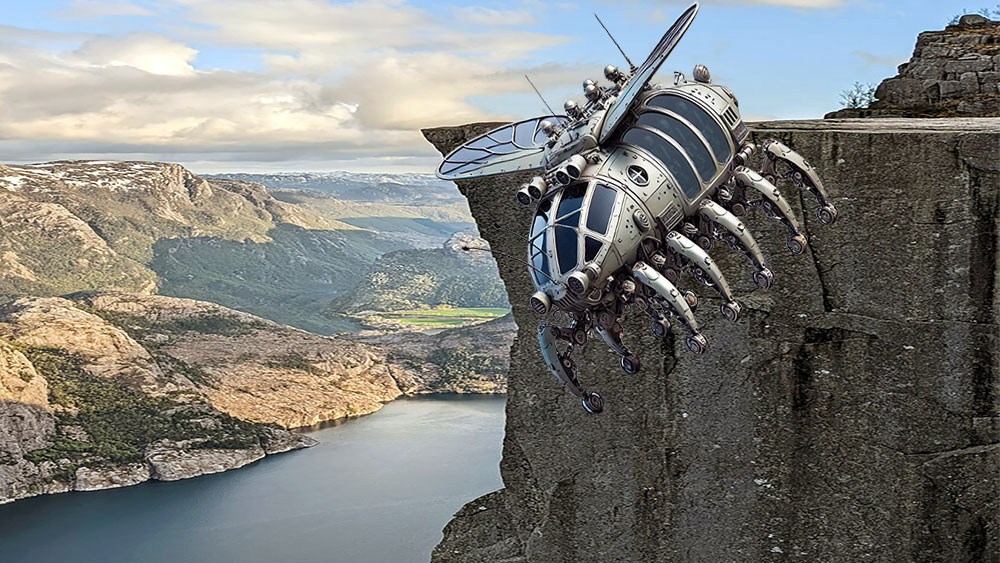 Le conducteur cherche un endroit adéquat, le trouve au bord d’une falaise, déploie les ailes en forme d’élytres dont est doté l’engin , prends son élan, … et plonge !!