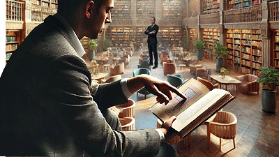L’ensemble de scène pivote progressivement dans le sens des aiguilles d’une montre et je découvre qu’en fait je suis assis dans une librairie dont je distingue le propriétaire au fond de la salle. Il ne semble pas offusqué par ma lecture prolongée des livres lui appartenant.