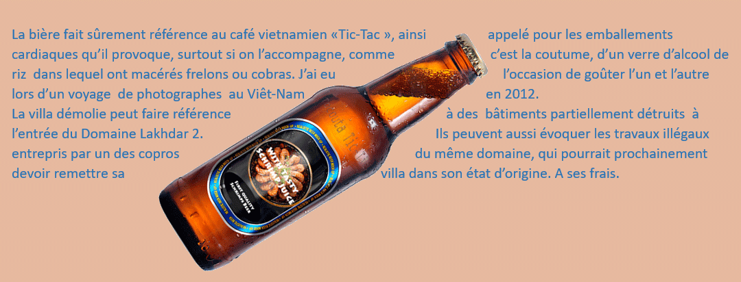 L’action : Mon voisin, entrepreneur français (activité non définie), a décider de détruire sa villa. La façade est déjà transformée en gravats. Puis il change d’avis et des ouvriers, apparemment marocains, entreprennent de consolider la partie non détruite, de fixer un nouveau portail, et de construire une nouvelle façade.
